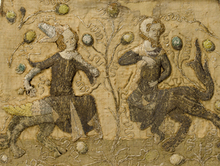 Brodée sur un velours de soie, elle représente trois hybrides mi-humains mi-animaux qui jouent de la musique, similaires aux grotesques qui foisonnent dans les marges des manuscrits. Les figures sont brodées en relief et rapportées sur le tissu de fond.