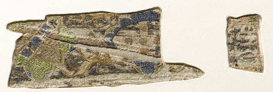 Ces fragments à la broderie raffinée proviennent d’une grande aumônière trapézoïdale, accessoire du vêtement masculin. Elle est consacrée au thème de l’homme sauvage, très en vogue au 14e-15e siècle.