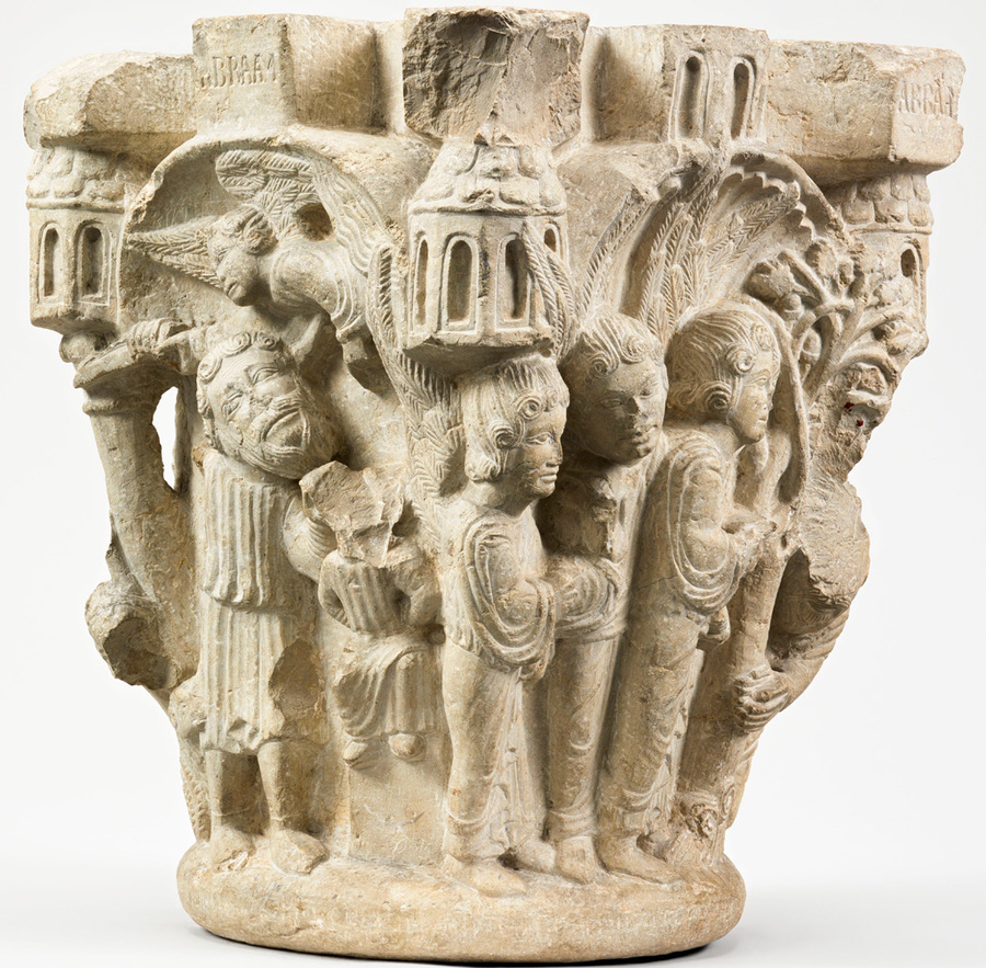 Le musée de Cluny possède un ensemble exceptionnel de huit chapiteaux à décor narratif ou animalier en provenance provenant du cloître du monastère catalan de Sant Pere de Rodes. L'histoire du patriarche Abraham se déploie ici sur la corbeille. On reconnaît notamment la scène de la rencontre au chêne de Mambré (Dieu, sous l'aspect de trois anges, apparaît à Abraham) et l'épisode du sacrifice d'Isaac.