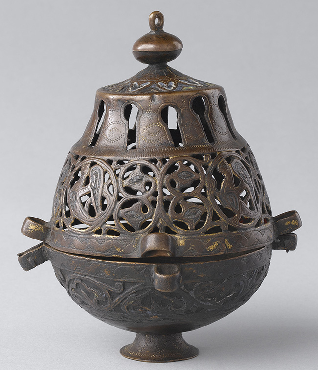 Cette coupe en hémisphères aplatis est munie de trois passants près du bord et ornée au-dessous d’un anneau de rinceaux en réserve sur fond bleu. Le couvercle conique à la base est surmonté d’un cône aplati en courbe douce. La partie conique inférieure est percée de quatre médaillons circulaires encadrant un griffon émaillé, séparé par un motif à jour formé de deux rinceaux en C adossés et ferronnés.