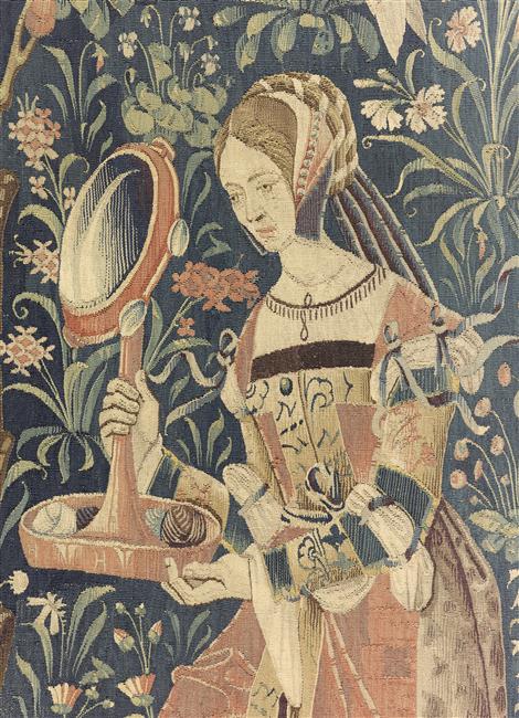 Une femme noble brode sur un coussin des fleurs qui rappellent le fond de cette tapisserie « mille fleurs », ainsi que le monogramme du Christ IHS (abréviation du nom de Jésus), signe de dévotion et d’une conduite vertueuse.