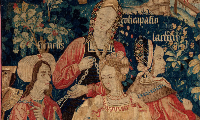Ce fragment de tapisserie appartenant au groupe de la tenture de l'Honneur présente les caractéristiques communes de l'ensemble. Il associe des costumes typiques du début du 16e siècle à une iconographie savante tirée de l'Antiquité. On trouve ici quatre femmes, identifiées comme deux Parques, Cloto et Lachésis, et deux maladies, Frenesis et Colicapasio, tirant les chaînes d'une structure aujourd'hui perdue. Il s'agit peut-être un vestige d'une scène de triomphe de l'honneur sur la mort et les maux de l'humanité. Ce fragment témoigne de la réappropriation des thèmes antiques à la Renaissance.